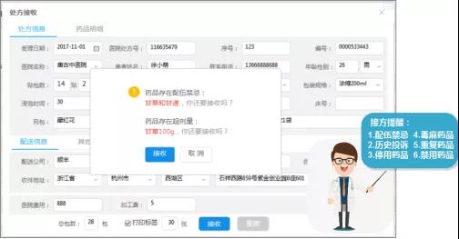 接方環(huán)節(jié)升級功能包括:訂單語音提醒、歷史投訴提醒,以及藥品的配伍禁忌、毒麻類、重復(fù)等特殊情況提醒。系統(tǒng)通過智能提醒來輔助接方人員注意并及時跟醫(yī)院溝通確認,提高接方效率并減少出錯率。