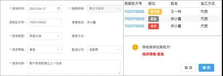煎藥系統(tǒng)升級投訴管理功能,方便客服人員記錄客戶的投訴,及時跟進處理結(jié)果。系統(tǒng)會在開方和處方列表中自動提示當前處方患者是否有過歷史投訴,從而更加注意煎程的質(zhì)量,提升客戶服務(wù)滿意度。