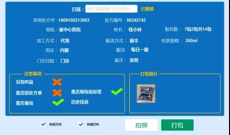 為了幫助煎藥中心滿足這些個性化的服務(wù)需求,同時也規(guī)范打包人員的操作,減少出錯率,系統(tǒng)推出全新的電腦端打包功能,可按照不同醫(yī)療機構(gòu)的要求提示打包人員。系統(tǒng)還結(jié)合高拍儀,拍照記錄成品藥液和另包藥品,一旦患者投訴則有據(jù)可查。