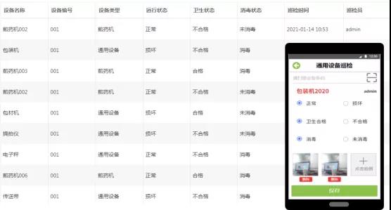 煎藥系統(tǒng)在原有的煎藥機巡檢基礎(chǔ)上升級全新的“設(shè)備巡檢”功能,可在系統(tǒng)維護各類設(shè)備,質(zhì)檢人員在現(xiàn)場使用手持進行巡檢記錄,也可拍攝現(xiàn)場照片上傳存檔。