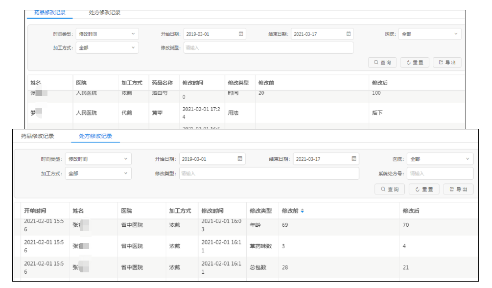 處方修改日志:記錄加工方式、配送方式、煎煮方案、包裝規(guī)格等處方主要信息的修改記錄。