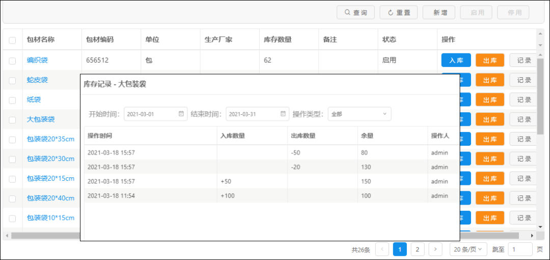 負責包材管理的人員可在煎藥系統(tǒng)進行包材基礎(chǔ)信息的維護,包材出、入庫相關(guān)的庫存管理,也可在系統(tǒng)查詢統(tǒng)計包材庫存量,核對庫存的歷史出入記錄。