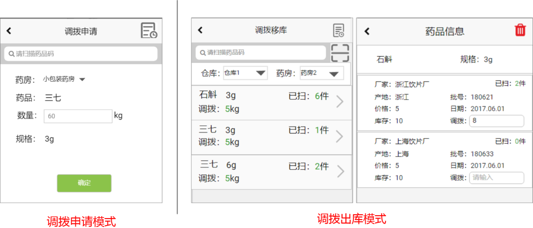 場景二:調(diào)撥出庫模式,適用于倉庫和藥房場地合并管理,調(diào)配藥柜缺藥時,出庫人員直接使用手持的調(diào)撥出庫操作。